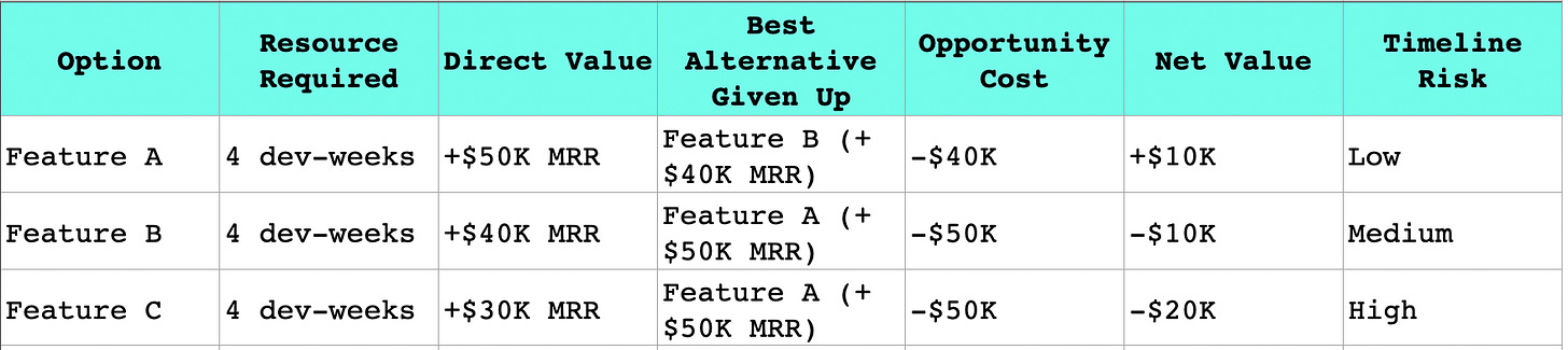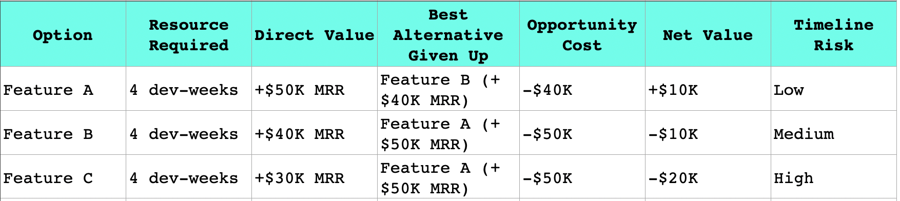 What it is: The value of the best alternative you give up when making a choice. In product development, every feature you build represents multiple features you don't build.